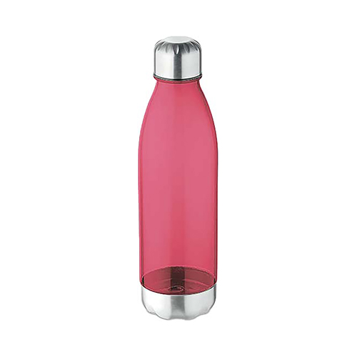 Botella plástica de cuerpo plástico traslúcido con tapa y base de acero inoxidable. Presentación en caja individual negra.