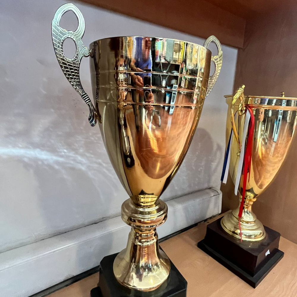 Copón metálico color oro, en cuerpo metálico con base plástica