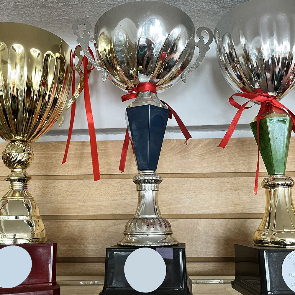 Copón metálico en color plata y azul, cuerpo plástico con base plástica.