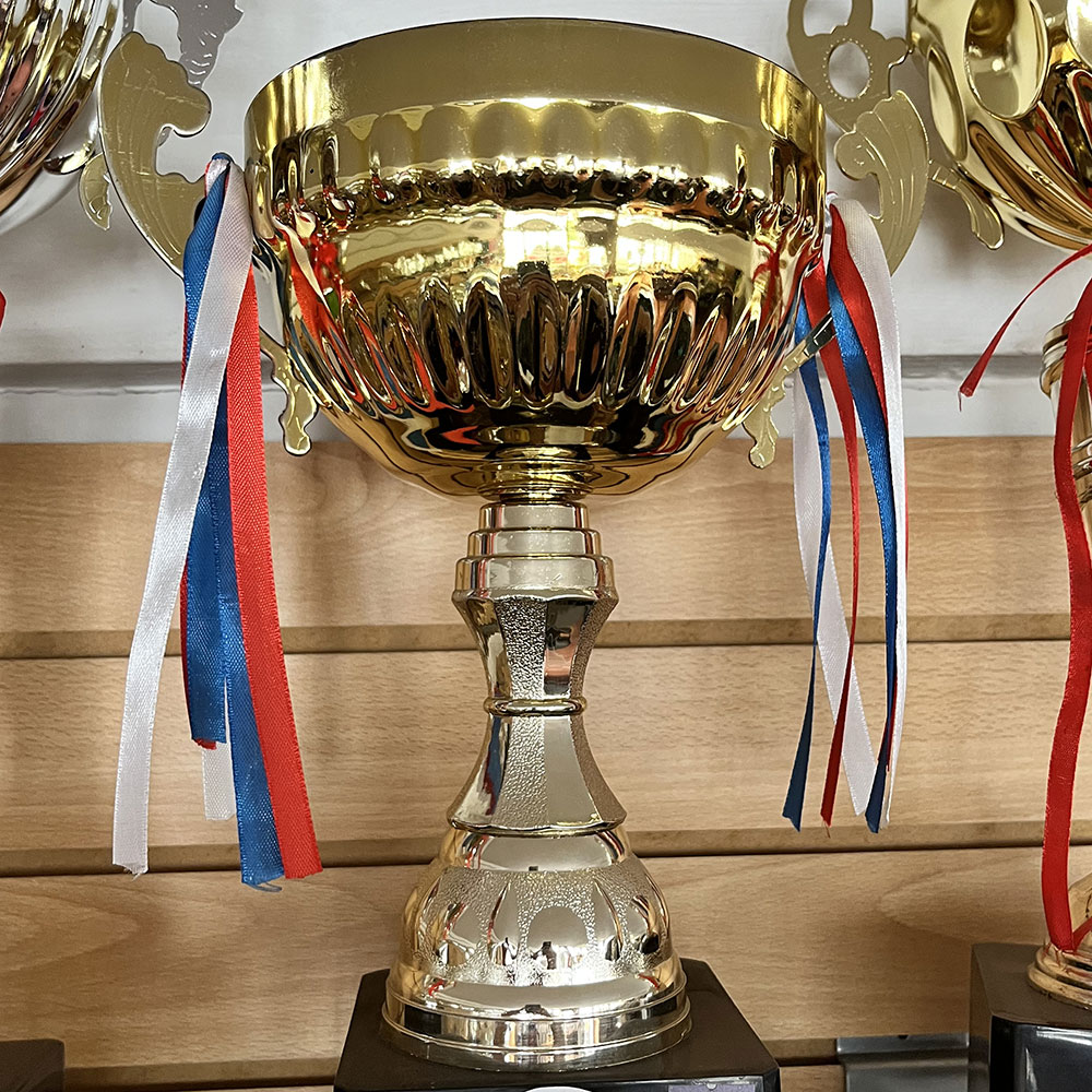 Copón metálico color oro, en cuerpo plástico con base plástica.