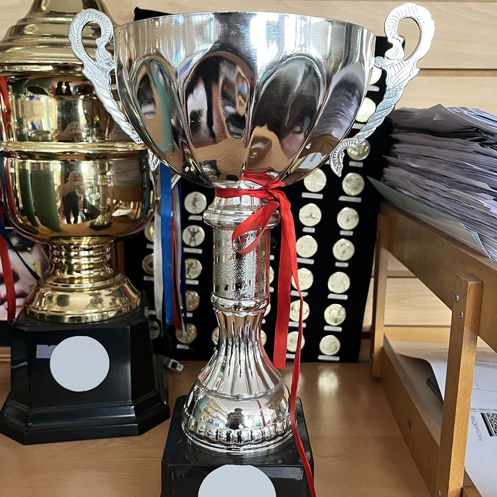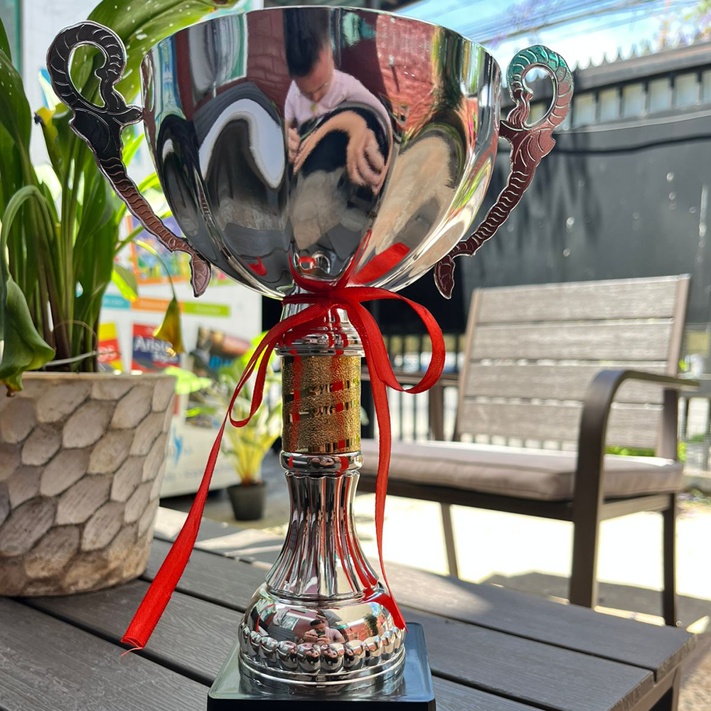 Copón metálico en cuerpo plástico color plata, con base plástica.