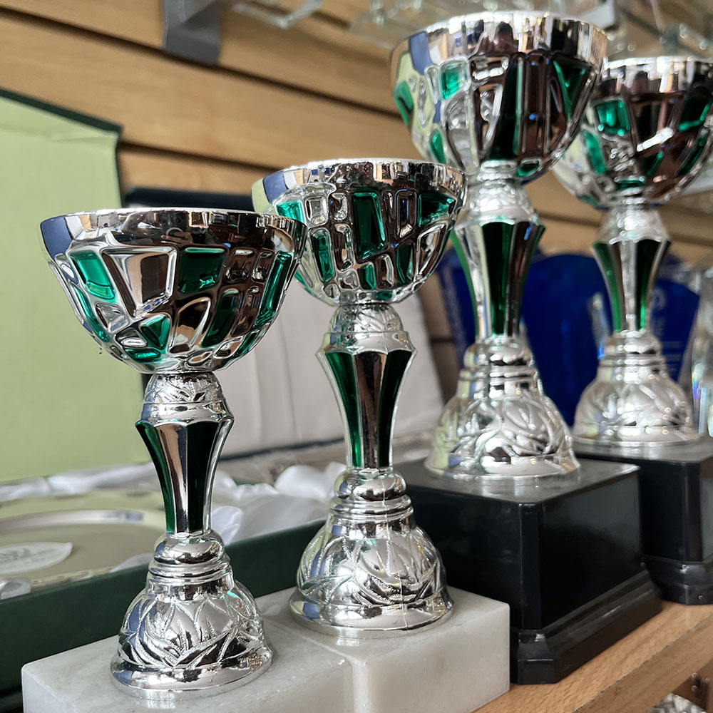 Copón metálico en cuerpo plástico con base de mármol.
