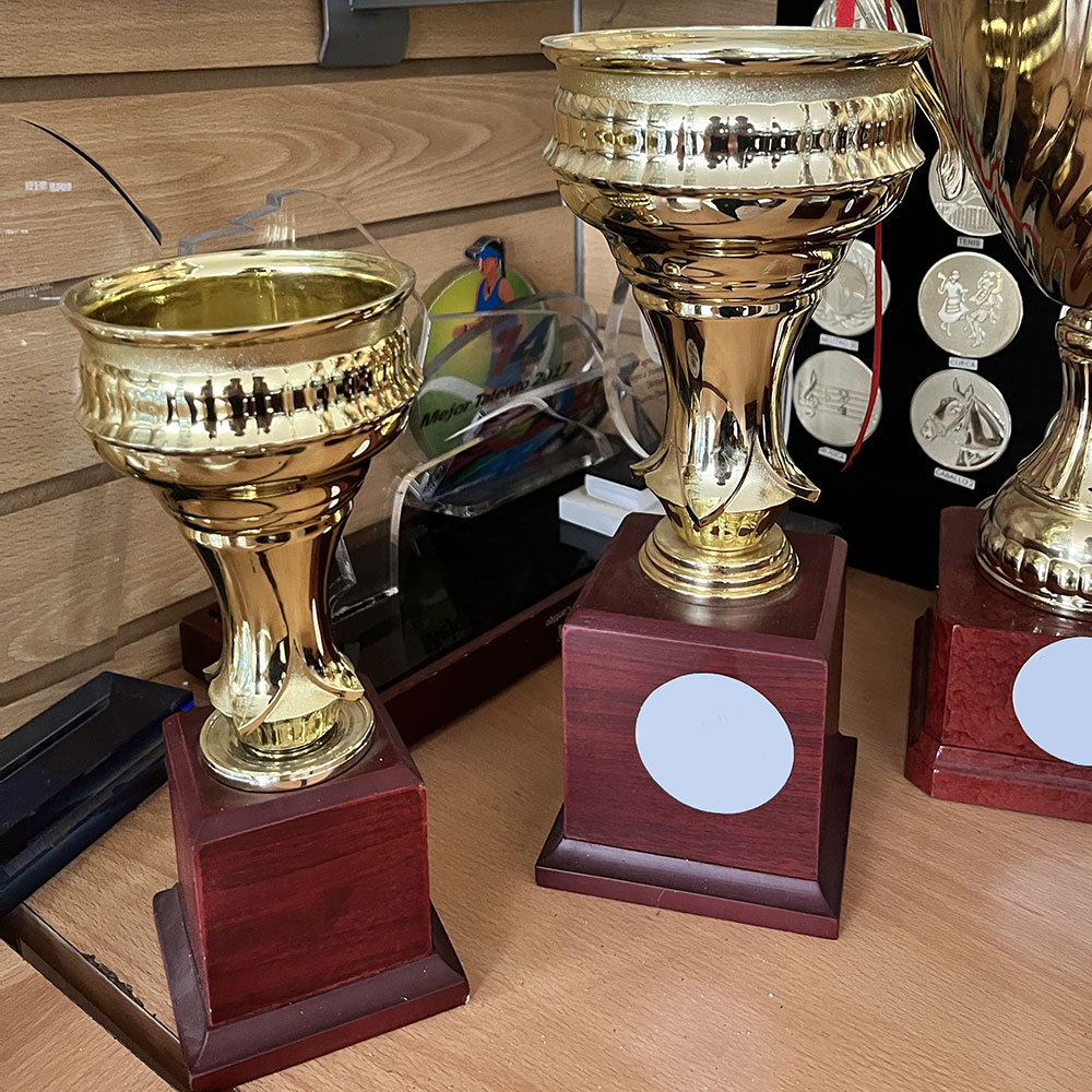 Copón plástico dorado, en base de madera.