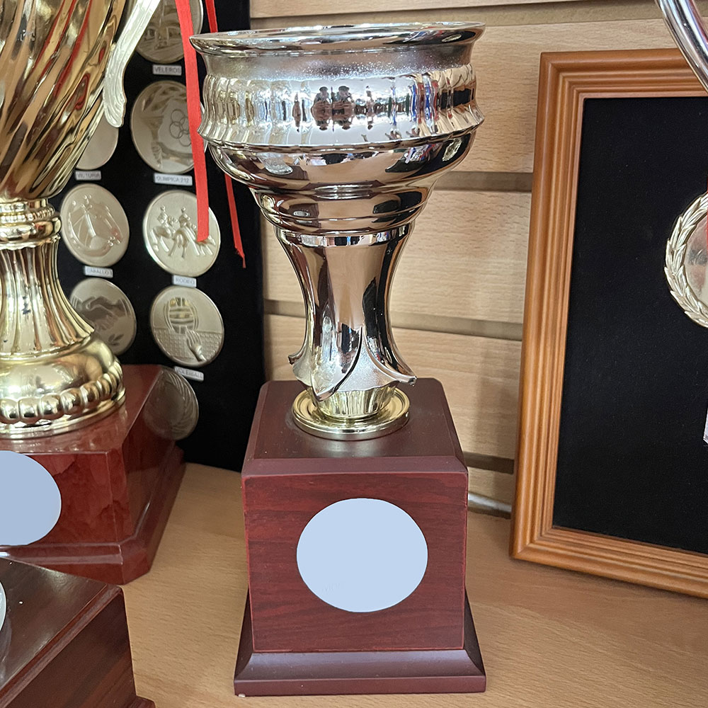 Copón plástico color plata, en base de madera de 8 x 8 cms.