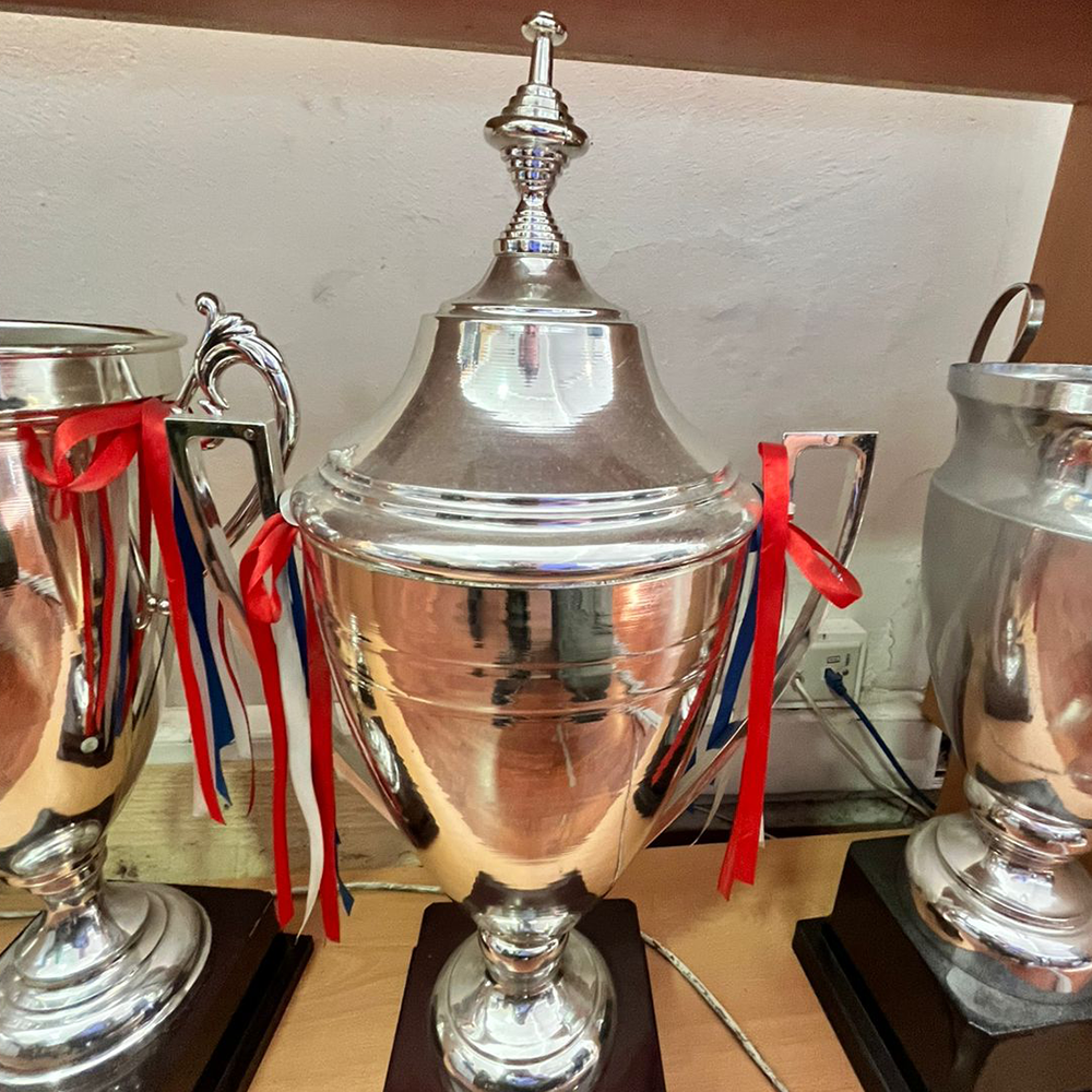 Copón metálico en cuerpo metálico con base de madera.