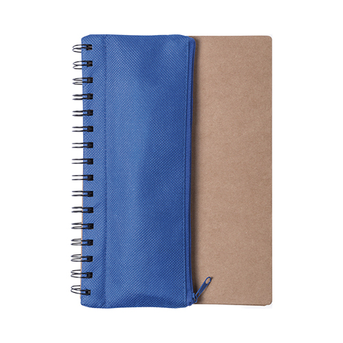 Libreta ecológica 70 hojas lisas, integrado estuche en poliéster 600D y cierre de cremallera, incluye útiles (bolígrafo en cartón reciclado , 2 lápices grafito , regla, sacapuntas en madera natural y goma para borrar). Presentación en bolsa individual.