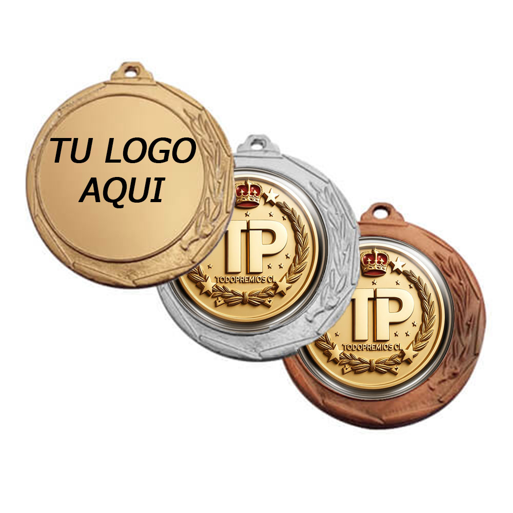 Medalla pequeña de 32mm de diámetro para reconocimiento con diseño hoja de trigo. Espacio para logo personalizado 25mm