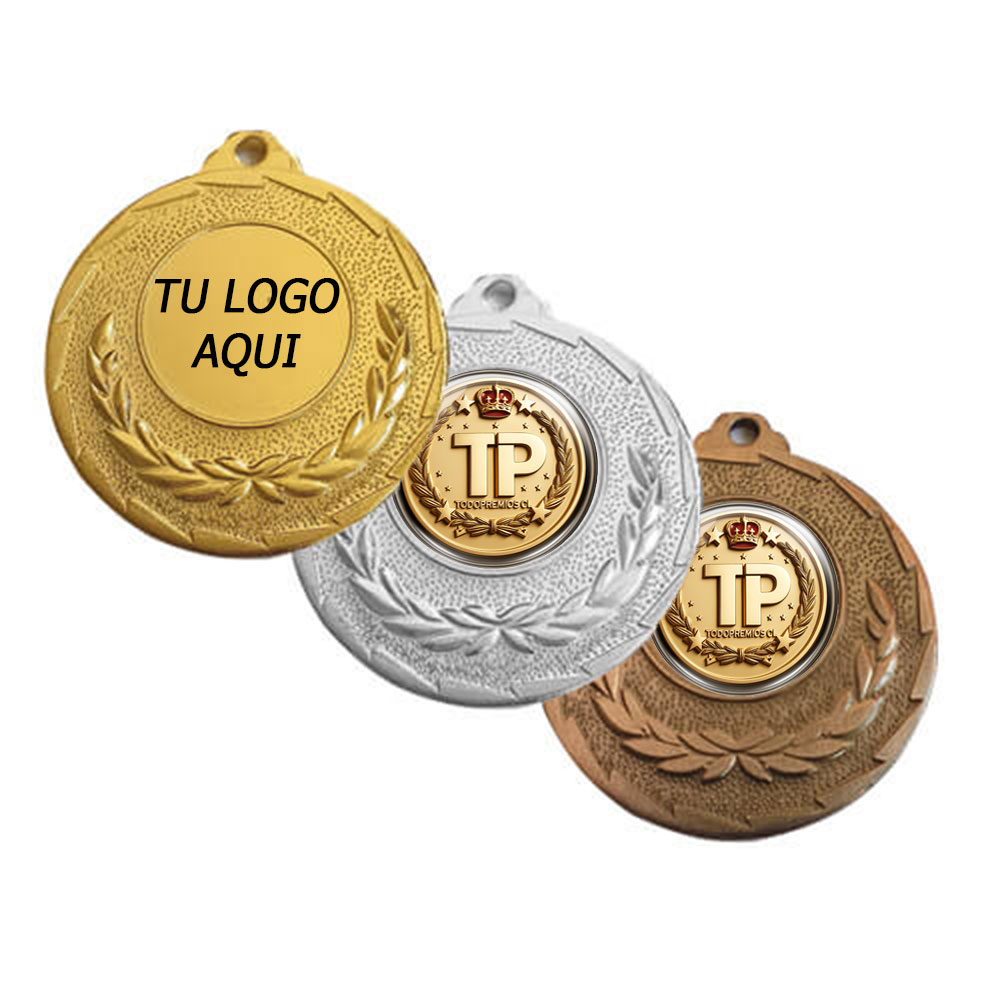 Medalla de 50mm de diámetro para reconocimiento con diseño hoja de laurel. Espacio para logo personalizado 25mm