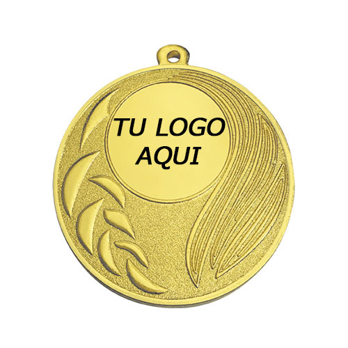 Medalla de 50mm de diámetro para reconocimiento con diseño hoja de laurel. Espacio para logo personalizado 25mm