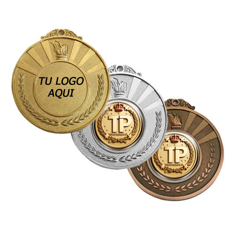 Medalla de 50mm de diámetro para reconocimiento con diseño antorcha. Espacio para logo personalizado 25mm