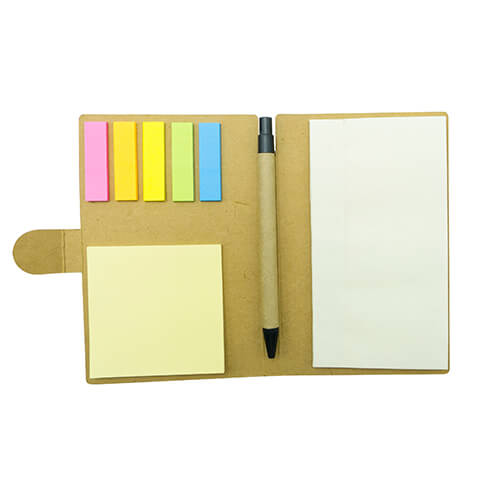 Memo set ecológico libreta que incluye set de Flag Post-it, bloc de notas cuadrado y rectangular como también un bolígrafo ecológico, tinta azul.