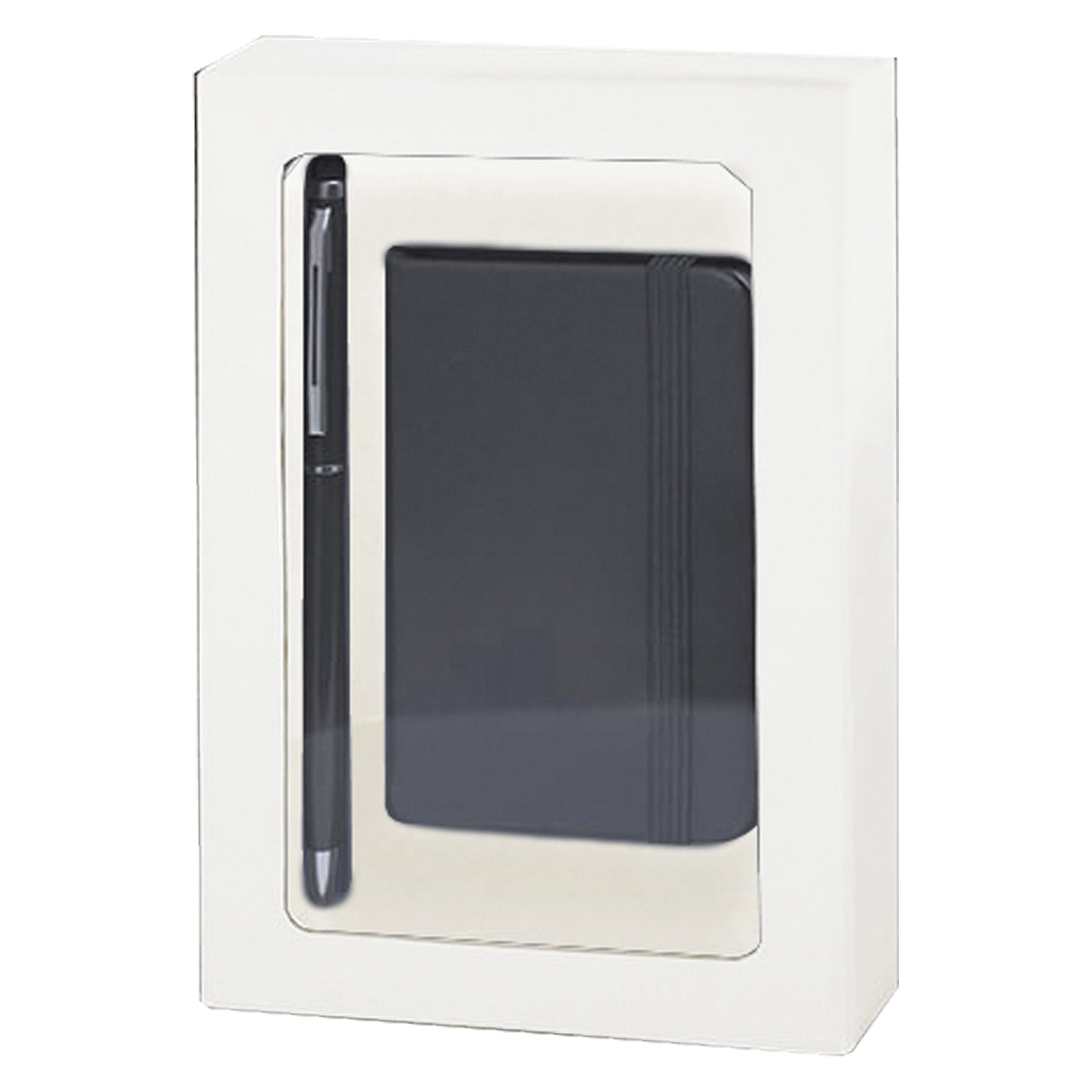 Set de bloc de notas con tapas de suave tacto acabadas en polipiel y bolígrafo de aluminio con puntero a juego.