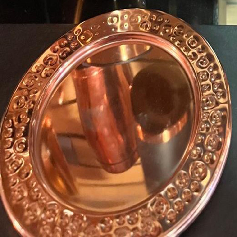 Set de 2 posavasos de acero inoxidable electro-plateado en cobre con puntos martillados. Presentación en caja de regalo negra.