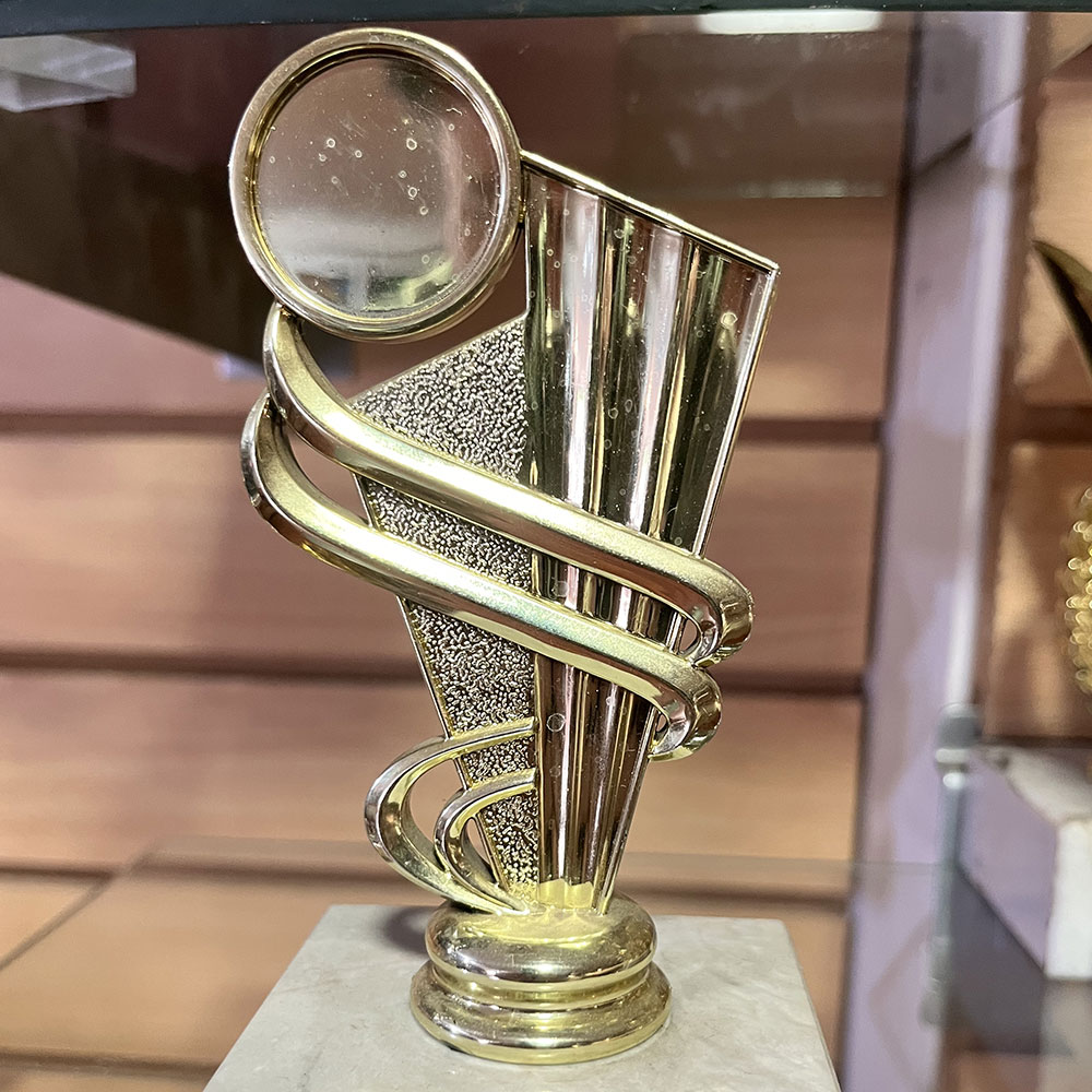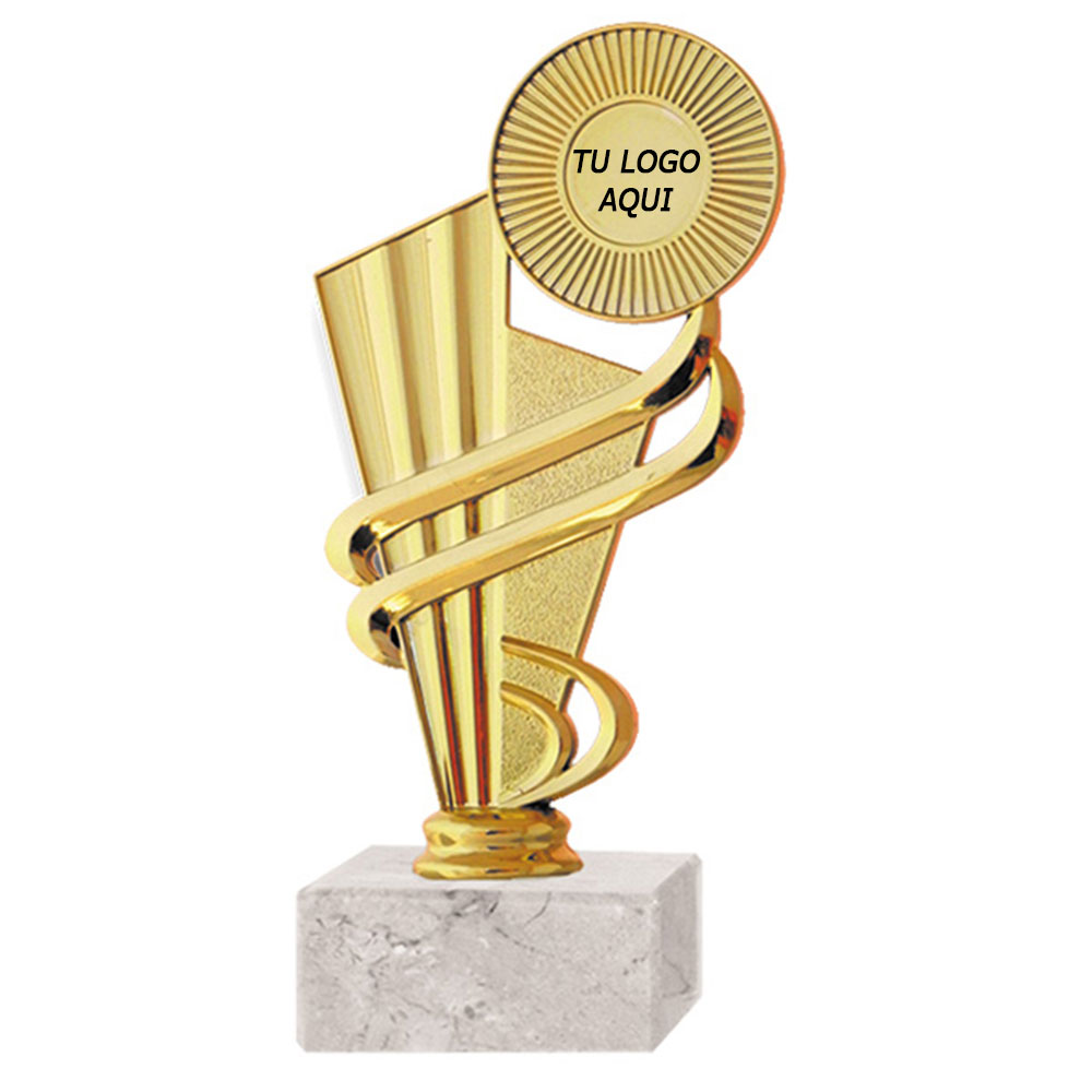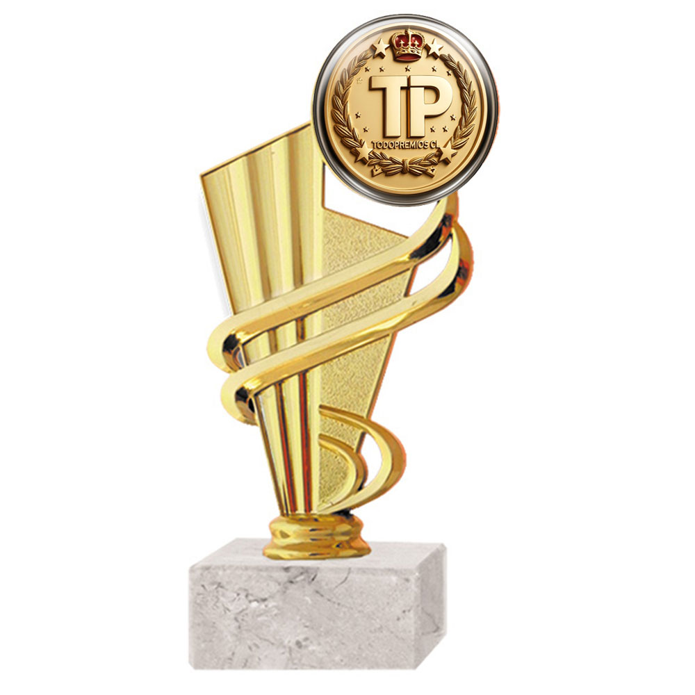 Trofeo plástico de color oro figura abanico para aplicación de domo o sello. Incluye base de mármol blanca. RP 8994-4