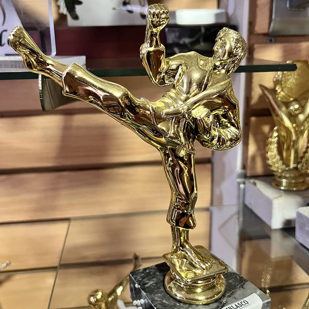 Trofeo plástico de color oro figura artes marciales. Incluye base de mármol blanca. Mod. 8015