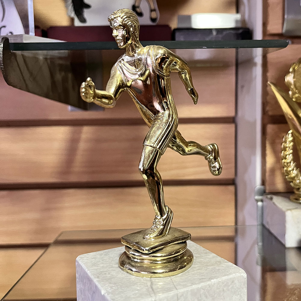 Trofeo plástico de color oro figura atletismo. Incluye base de mármol blanca. Mod. 8003