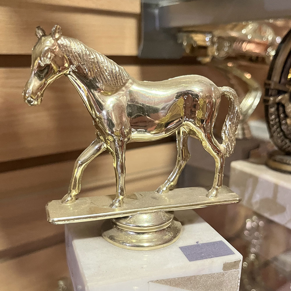 Trofeo plástico de color oro figura caballo con base. Incluye base de mármol blanca. Mod. 8068
