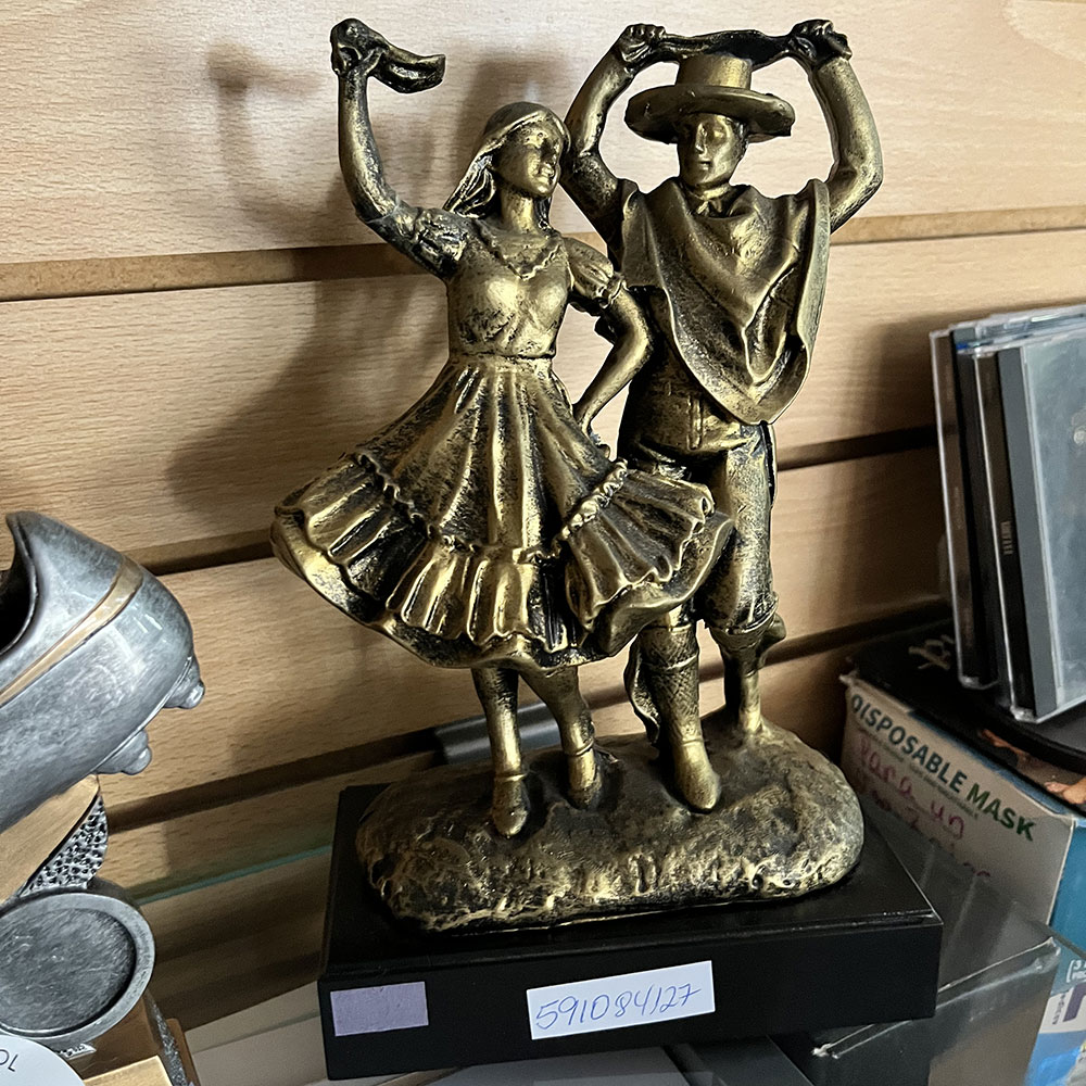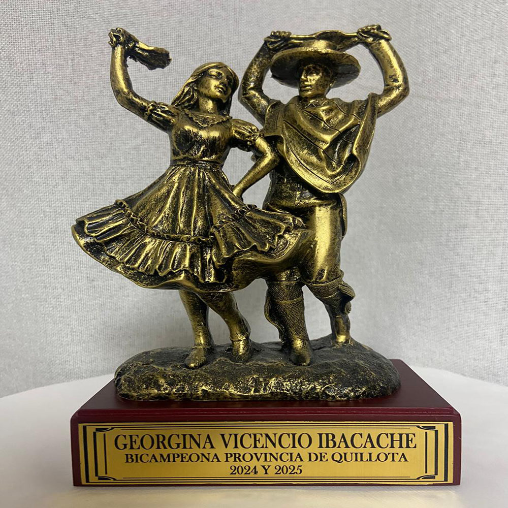 Trofeo de Resina con temática de cueca pintado de color oro. Incluye base de madera. Presentación en caja de cartón con interior de aislapol. Mod. Cueca 23C