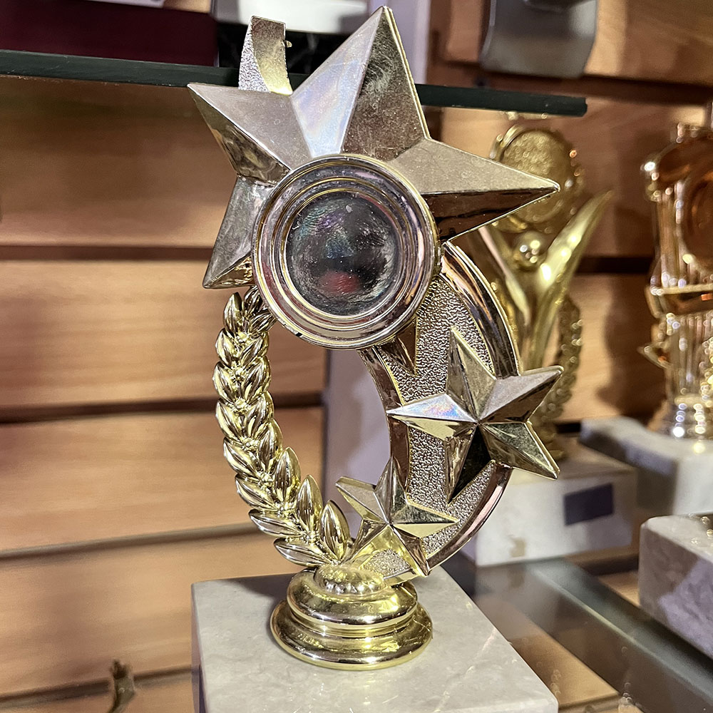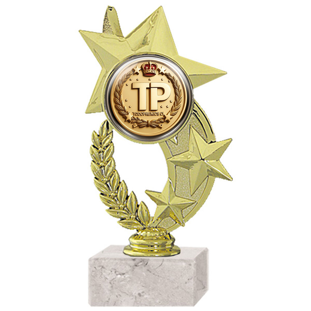 Trofeo plástico de color oro figura estrella para aplicación de domo o sello. Incluye base de mármol blanca. Insert 25mm. Mod. 8909-5