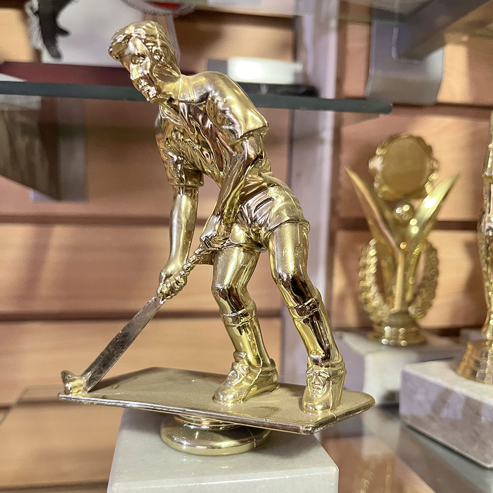 Trofeo plástico de color oro figura hockey masculino. Incluye base de mármol blanca. Mod. 8147