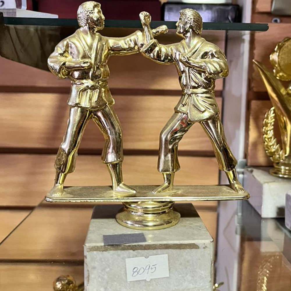 Trofeo plástico de color oro figura karate doble. Incluye base de mármol blanca. Mod. 8095