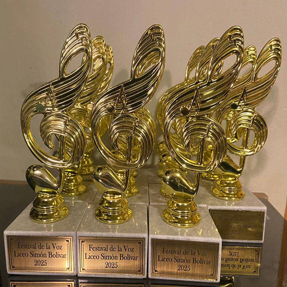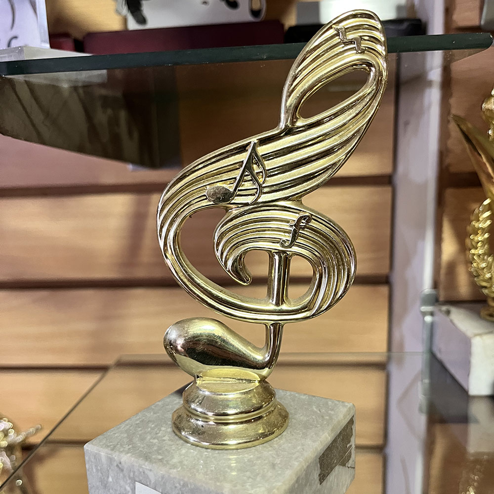 Trofeo plástico de color oro figura nota musical. Incluye base de mármol blanca. Mod. 8054-5