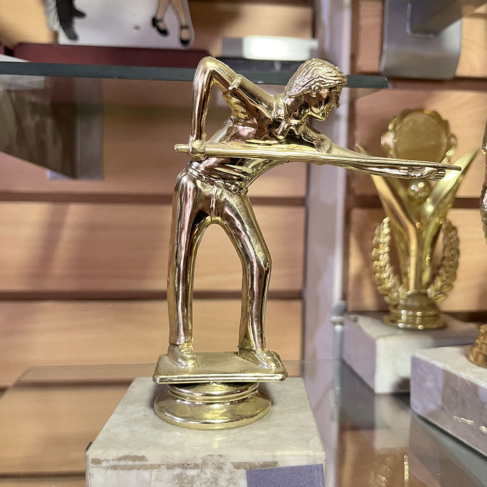 Trofeo plástico de color oro figura Pool. Incluye base de mármol blanca. Mod. 8059