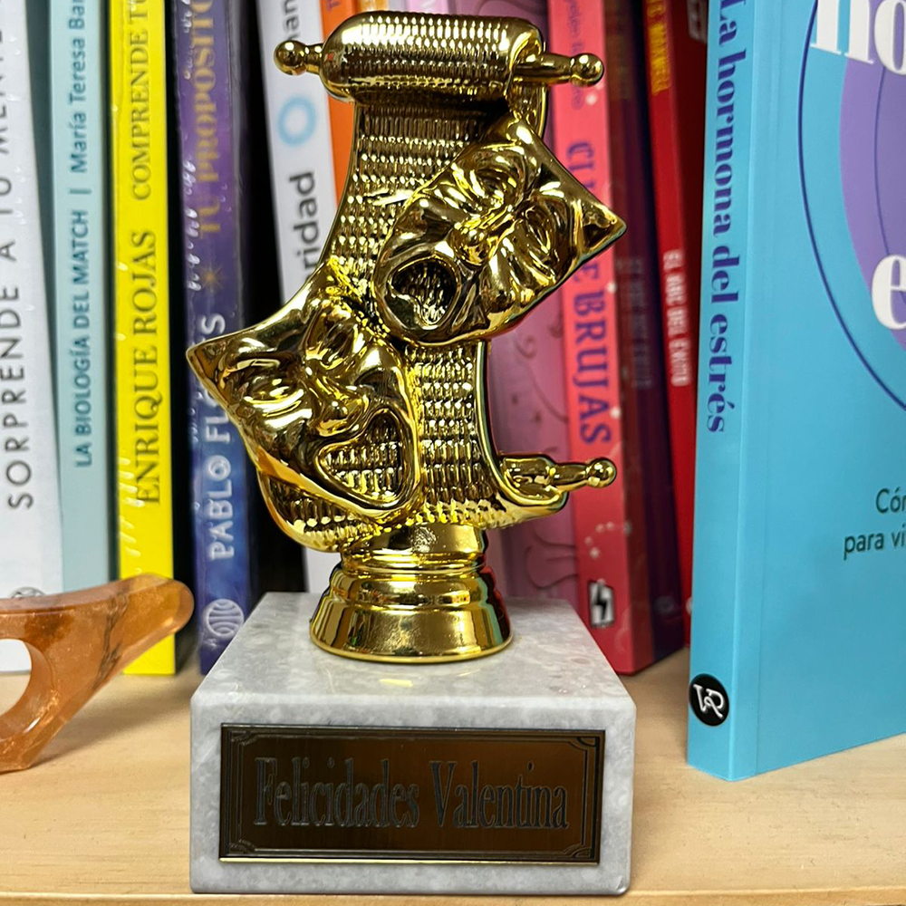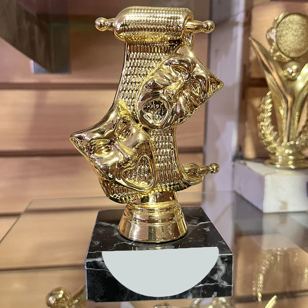 Trofeo plástico de color oro figura teatro. Incluye base de mármol blanca. Mod. 8245